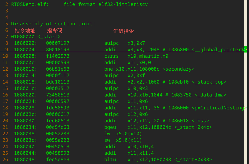 riscv32-unknown-elf-objdump -d -M no-aliases,numeric RTOSDemo.elf > RTOSDemo.disdis文件内容: